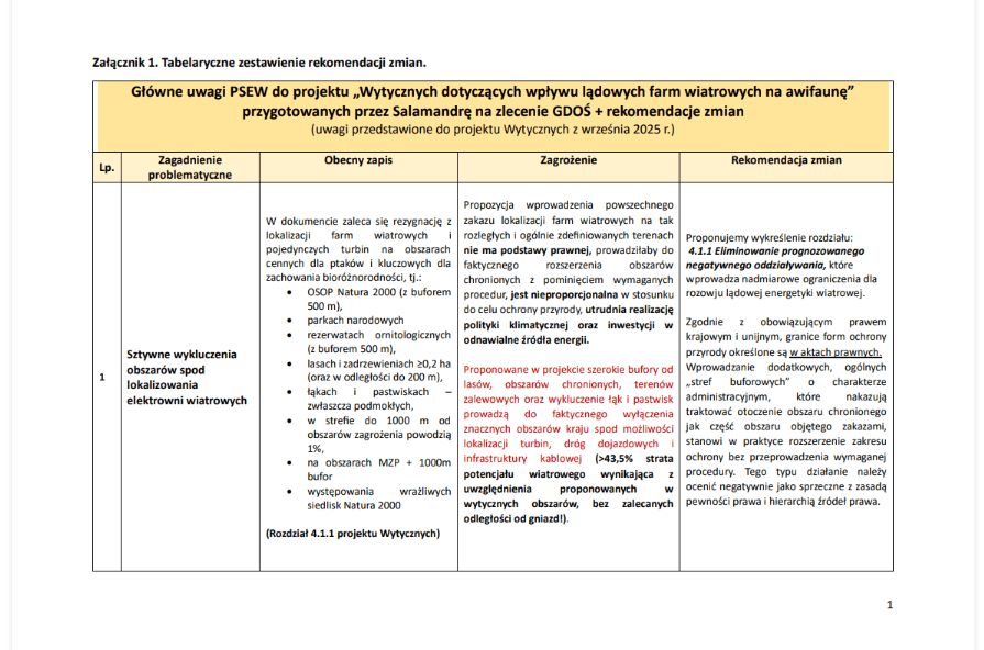 Tabelaryczne zestawienie rekomendacji zmian ws. wytycznych dot. wpływu LEW na awifaunę