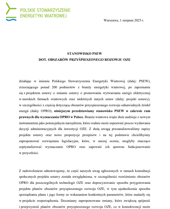 Stanowisko PSEW dot. obszarów przyśpieszonego rozwoju OZE (OPRO)